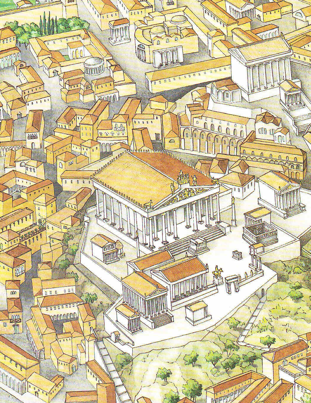 Templo de Júpiter Capitolino. Sobre él, a un lado, el Templo del dios Trajano