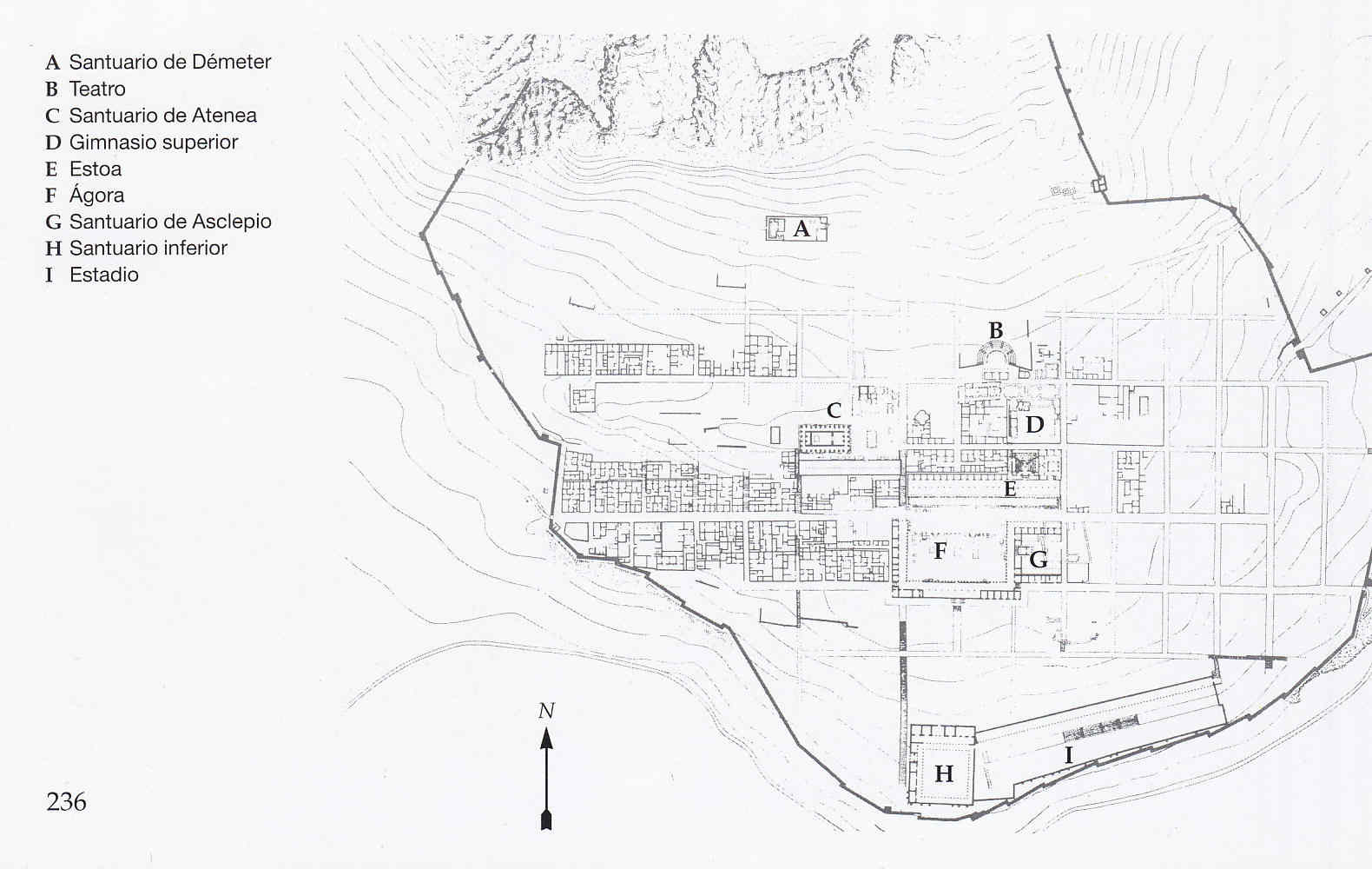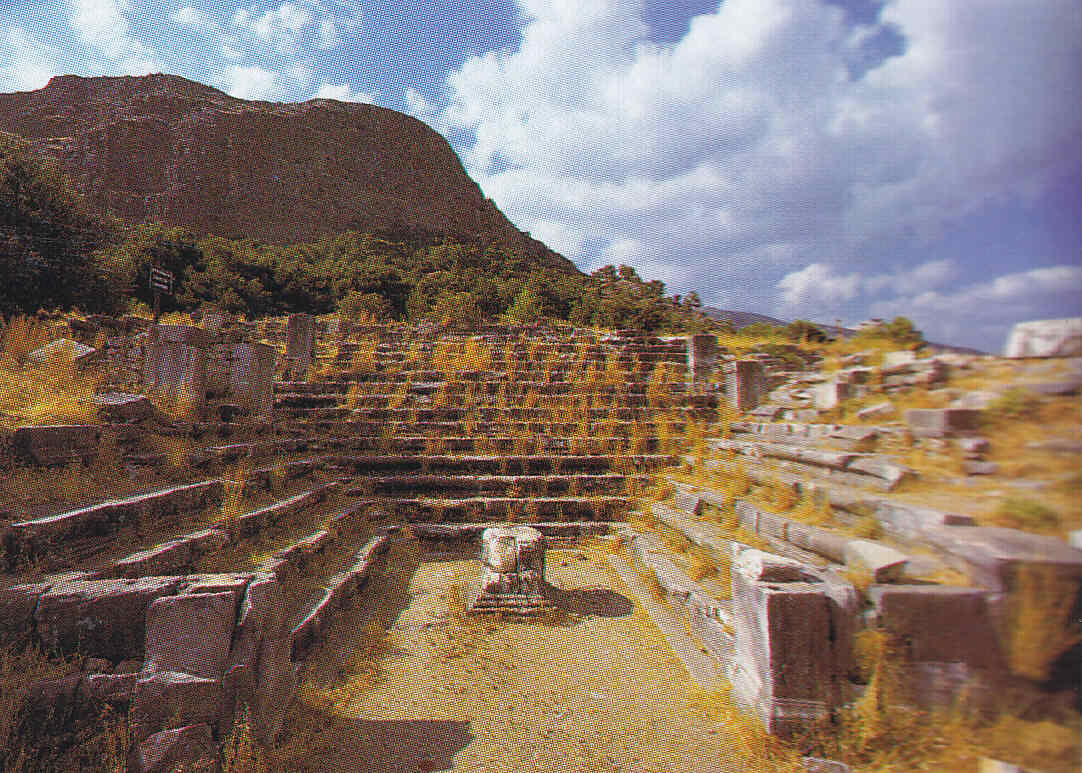 Puesto que de una magistrado de Priene hemos tratado hoy, hemos querido ofrecer al lector el aspecto de una ciudad cualquiera, situada en la Caria, al Este de Asia Menor, la actual Turquía. La ciudad, primitivamente situada en la llanura y para evitar sus frecuentes inundaciones, se reconstruyó en la ladera del monte cercano, el Mikale, que contaba con cuatro terrazas contiguas. La diferencia de nivel hizo que las calles que suben a la montaña, dirección Norte–Sur, deban ser escalonadas, mientras que las que siguen la dirección Este–Oeste son normales. En la plataforma superior, el Templo de Atenea, con una escalinata ceremonial. Aún más elevado, el Templo más pequeño de Démeter, para los misterios ligados a la diosa. En el centro de la ciudad, el Foro, porticado y con altares, con el Templo de Asclepio anexo, y sobre él, la Stoa, o Pórtico. En la parte superior, el Teatro, del que se conserva el primer piso de la escena, en piedra, y que no sale en la imagen, pues está justo donde las dos hojas del libro se unen, siendo imposible su escaneo. El Estadio, en la primera plataforma, y sobre él otro Pórtico, que sin duda permitía extender la vista sobre la llanura.