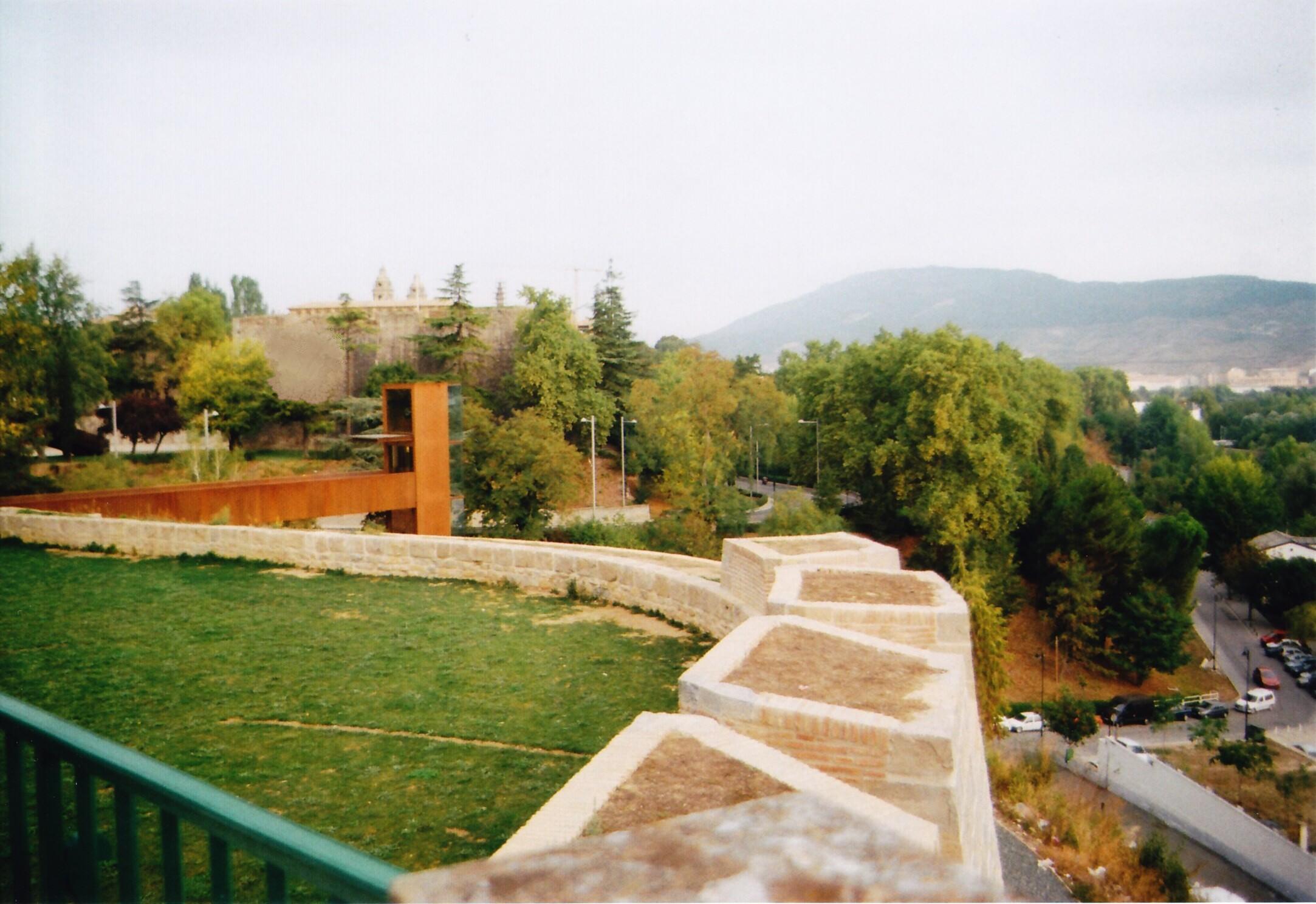Y para terminar la visita del Fuerte, veamos su terreno circundante, las murallas que lo bordeaban, situadas en la parte alta, sobre el desnivel que lleva al río. Esa masa metálica naranja es un ascensor, construido recientemente para facilitar al personal la subida y bajada de la ciudad al nivel del río, a las huertas de la Magdalena. El monte del fondo, el monte San Cristóbal [vivimos rodeados de santos en esta santa ciudad …], su cumbre, a la izquierda, marca el Norte de Pamplona